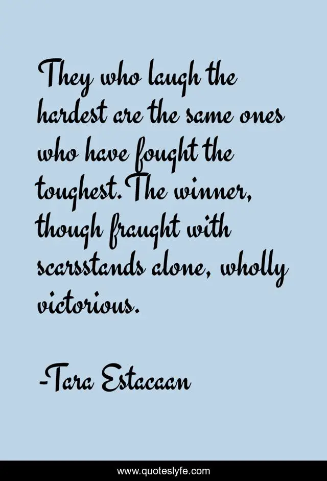 This page presents the quote "They who laugh the hardest are the same ones who have fought the toughest.The winner, though fraught with scarsstands alone, wholly victorious.". Author of this quote is Tara Estacaan. This quote is about victory-is-yours, winner-stands-alone, laugh, triumph,.