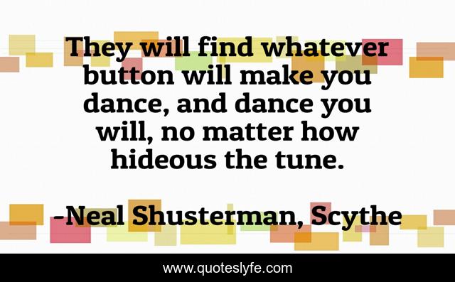 This page presents the quote "They will find whatever button will make you dance, and dance you will, no matter how hideous the tune.". Author of this quote is Neal Shusterman, Scythe. .