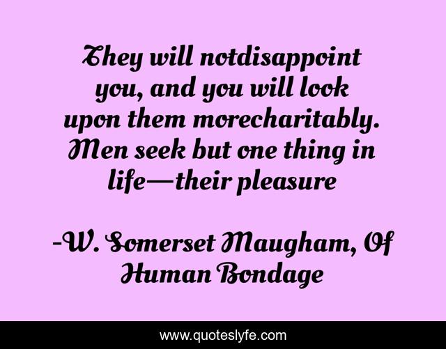 This page presents the quote "They will notdisappoint you, and you will look upon them morecharitably. Men seek but one thing in life—their pleasure". Author of this quote is W. Somerset Maugham, Of Human Bondage. This quote is about pleasure, life, society,.