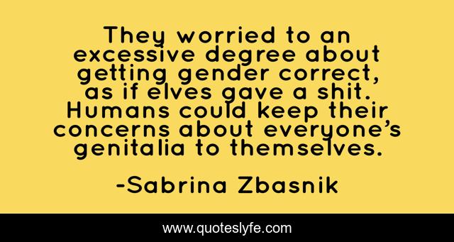 This page presents the quote "They worried to an excessive degree about getting gender correct, as if elves gave a shit. Humans could keep their concerns about everyone’s genitalia to themselves.". Author of this quote is Sabrina Zbasnik. This quote is about elf, assassin, humor, science-fiction,.