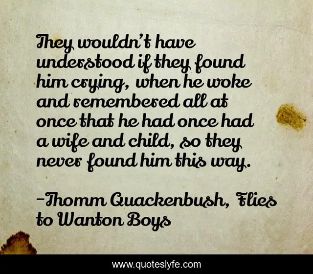 This page presents the quote "They wouldn’t have understood if they found him crying, when he woke and remembered all at once that he had once had a wife and child, so they never found him this way.". Author of this quote is Thomm Quackenbush, Flies to Wanton Boys. This quote is about cry, crying, vulnerable,.