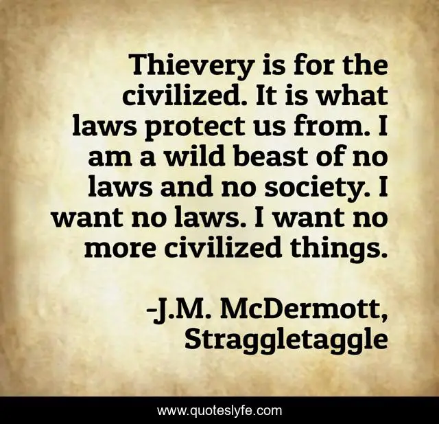 This page presents the quote "Thievery is for the civilized. It is what laws protect us from. I am a wild beast of no laws and no society. I want no laws. I want no more civilized things.". Author of this quote is J.M. McDermott, Straggletaggle. This quote is about freedom, civilization, laws, nature,.