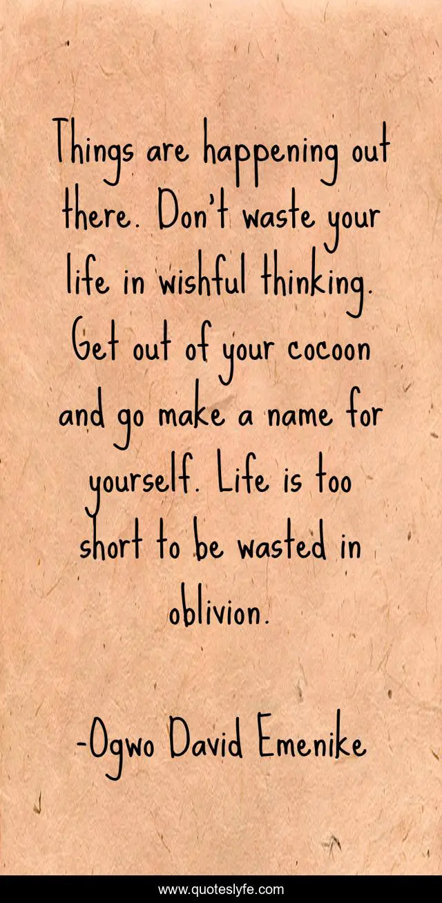 This page presents the quote "Things are happening out there. Don’t waste your life in wishful thinking. Get out of your cocoon and go make a name for yourself. Life is too short to be wasted in oblivion.". Author of this quote is Ogwo David Emenike. This quote is about life, work, positive, motivational, explore, oblivion, optimistic, inspirational, enthusiasm,.