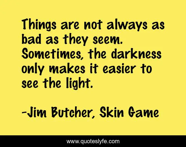 This page presents the quote "Things are not always as bad as they seem. Sometimes, the darkness only makes it easier to see the light.". Author of this quote is Jim Butcher, Skin Game. This quote is about enthusiasm, philosophical, inspirational, optimism,.