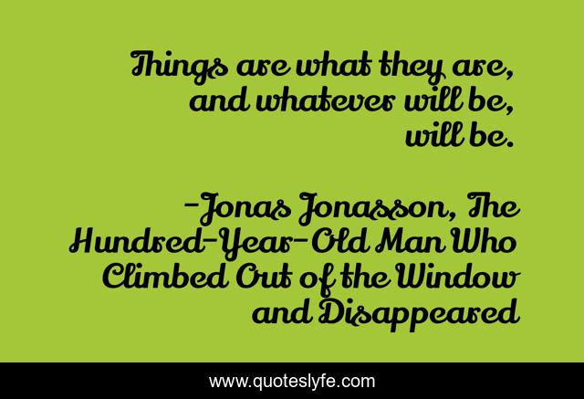 This page presents the quote "Things are what they are, and whatever will be, will be.". Author of this quote is Jonas Jonasson, The Hundred-Year-Old Man Who Climbed Out of the Window and Disappeared. .