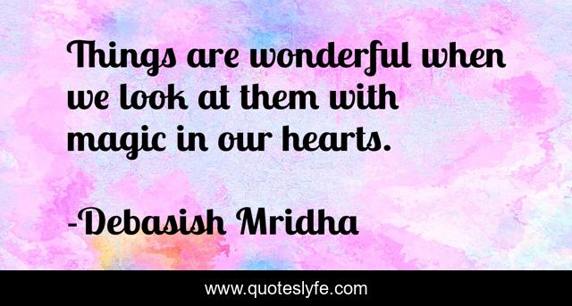 This page presents the quote "Things are wonderful when we look at them with magic in our hearts.". Author of this quote is Debasish Mridha. This quote is about hearts, love, philosophy, debasish-mridha, quotes, things-are-wonderful, inspirational, enthusiasm, magic,.