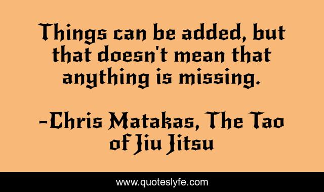 This page presents the quote "Things can be added, but that doesn't mean that anything is missing.". Author of this quote is Chris Matakas, The Tao of Jiu Jitsu. This quote is about spirituality, detachment, contentment,.