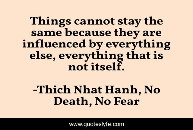 This page presents the quote "Things cannot stay the same because they are influenced by everything else, everything that is not itself.". Author of this quote is Thich Nhat Hanh, No Death, No Fear. .
