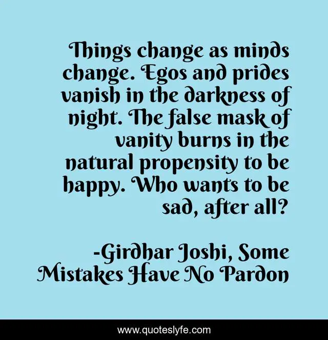 This page presents the quote "Things change as minds change. Egos and prides vanish in the darkness of night. The false mask of vanity burns in the natural propensity to be happy. Who wants to be sad, after all?". Author of this quote is Girdhar Joshi, Some Mistakes Have No Pardon. This quote is about sad, pride, ego, vanity,.