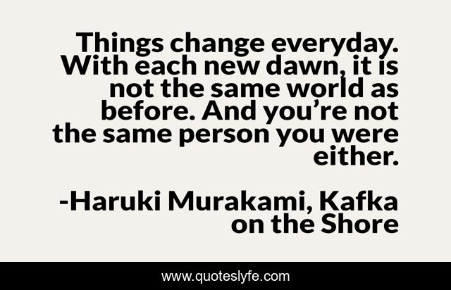This page presents the quote "Things change everyday. With each new dawn, it is not the same world as before. And you’re not the same person you were either.". Author of this quote is Haruki Murakami, Kafka on the Shore. This quote is about everyday-life, life-experiences, life, life-lessons, self-realization,.