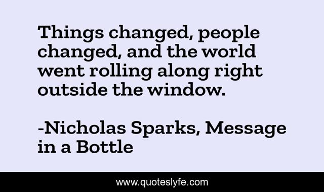 This page presents the quote "Things changed, people changed, and the world went rolling along right outside the window.". Author of this quote is Nicholas Sparks, Message in a Bottle. .