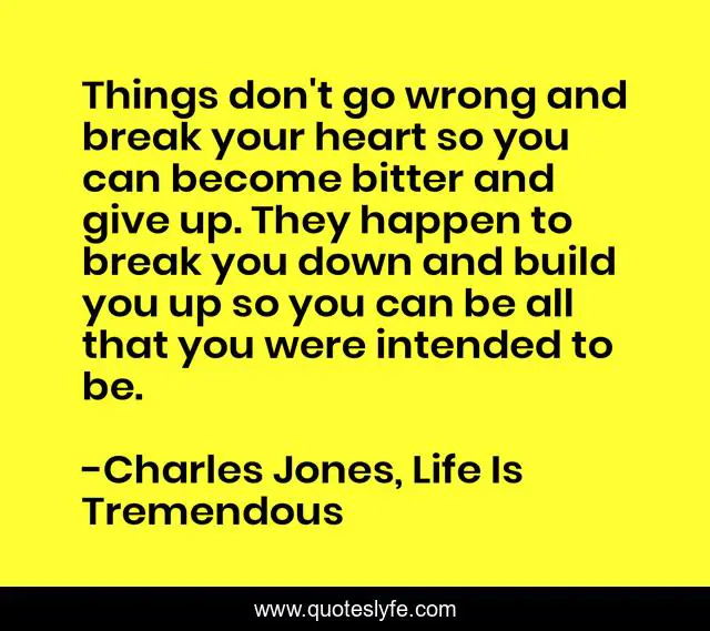 This page presents the quote "Things don't go wrong and break your heart so you can become bitter and give up. They happen to break you down and build you up so you can be all that you were intended to be.". Author of this quote is Charles Jones, Life Is Tremendous. .