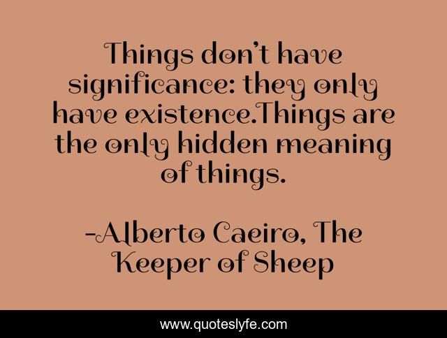 This page presents the quote "Things don’t have significance: they only have existence.Things are the only hidden meaning of things.". Author of this quote is Alberto Caeiro, The Keeper of Sheep. This quote is about pantheism, existence, god, secrets, things, understanding, it-is-what-it-is, meaning, significance,.