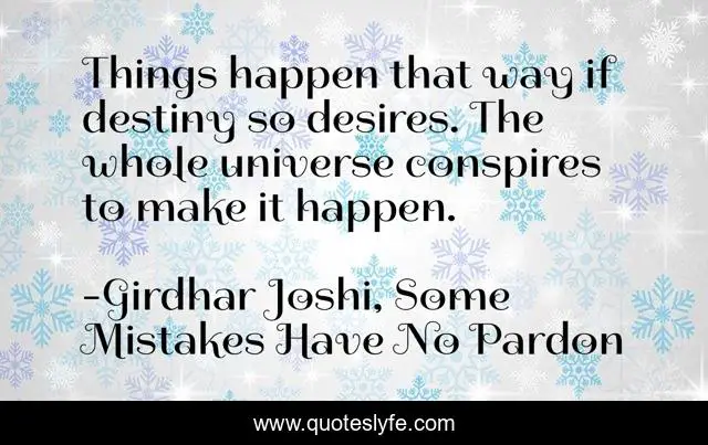 This page presents the quote "Things happen that way if destiny so desires. The whole universe conspires to make it happen.". Author of this quote is Girdhar Joshi, Some Mistakes Have No Pardon. This quote is about universe, conspire, destiny,.