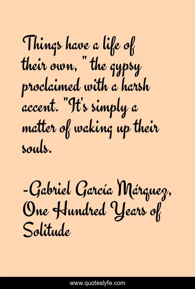 This page presents the quote "Things have a life of their own, " the gypsy proclaimed with a harsh accent. "It's simply a matter of waking up their souls.". Author of this quote is Gabriel García Márquez, One Hundred Years of Solitude. .
