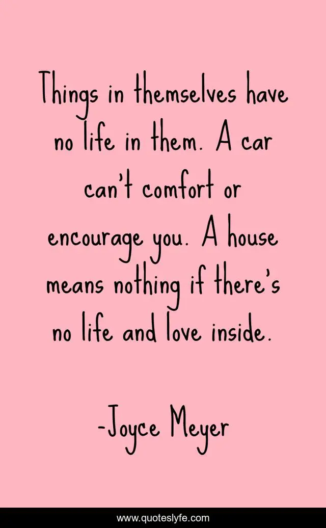 This page presents the quote "Things in themselves have no life in them. A car can't comfort or encourage you. A house means nothing if there's no life and love inside.". Author of this quote is Joyce Meyer. This quote is about life, comfort, love, affection,.