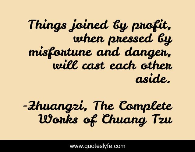 This page presents the quote "Things joined by profit, when pressed by misfortune and danger, will cast each other aside.". Author of this quote is Zhuangzi, The Complete Works of Chuang Tzu. This quote is about profit, avarice, taoism, greed, danger,.