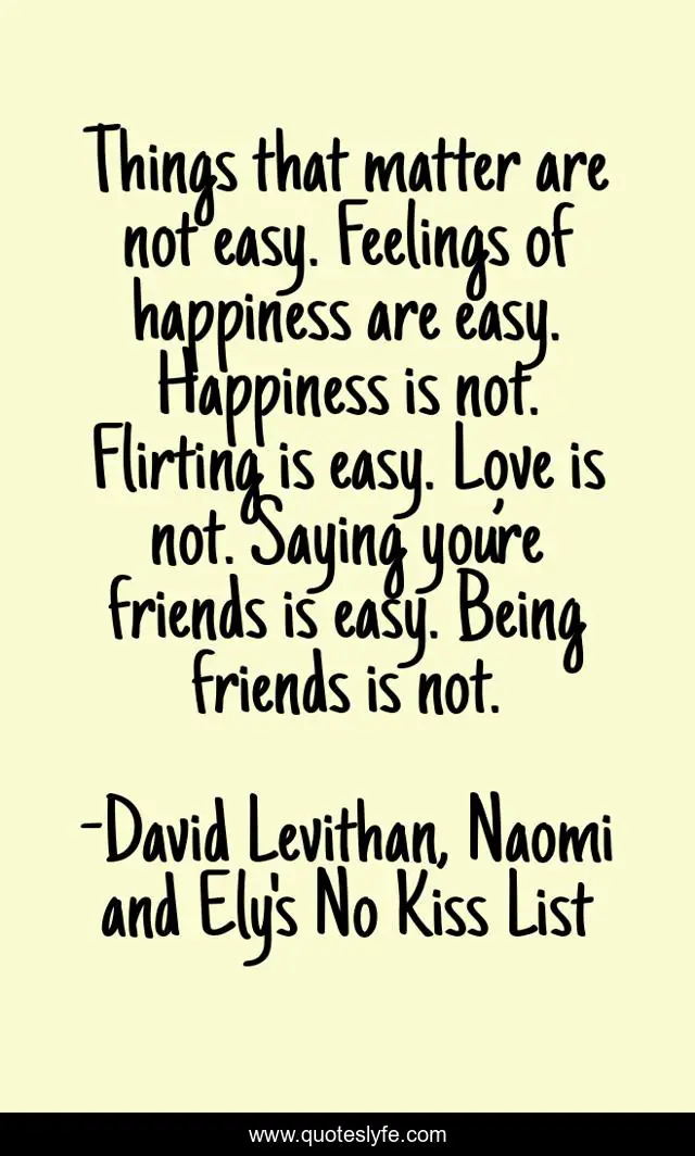 This page presents the quote "Things that matter are not easy. Feelings of happiness are easy. Happiness is not. Flirting is easy. Love is not. Saying you’re friends is easy. Being friends is not.". Author of this quote is David Levithan, Naomi and Ely's No Kiss List. This quote is about friends, self, love, affection,.