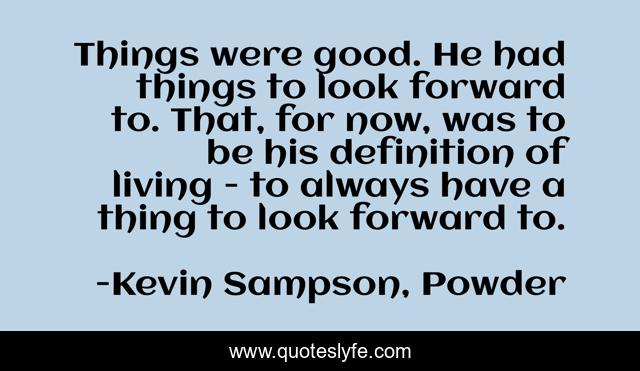 This page presents the quote "Things were good. He had things to look forward to. That, for now, was to be his definition of living - to always have a thing to look forward to.". Author of this quote is Kevin Sampson, Powder. This quote is about living, life,.