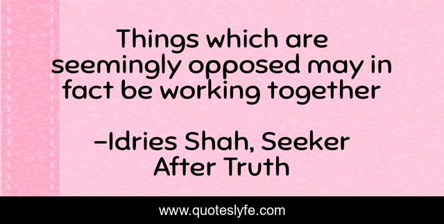 This page presents the quote "Things which are seemingly opposed may in fact be working together". Author of this quote is Idries Shah, Seeker After Truth. This quote is about rumi, sufis, logic, sufism,.