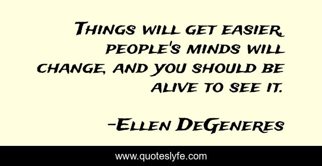 This page presents the quote "Things will get easier, people's minds will change, and you should be alive to see it.". Author of this quote is Ellen DeGeneres. This quote is about life, ellen-degeneres, bullying, inspirational, enthusiasm, hope,.