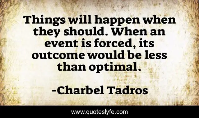 This page presents the quote "Things will happen when they should. When an event is forced, its outcome would be less than optimal.". Author of this quote is Charbel Tadros. This quote is about timing, patience, outcome, success, wisdom,.