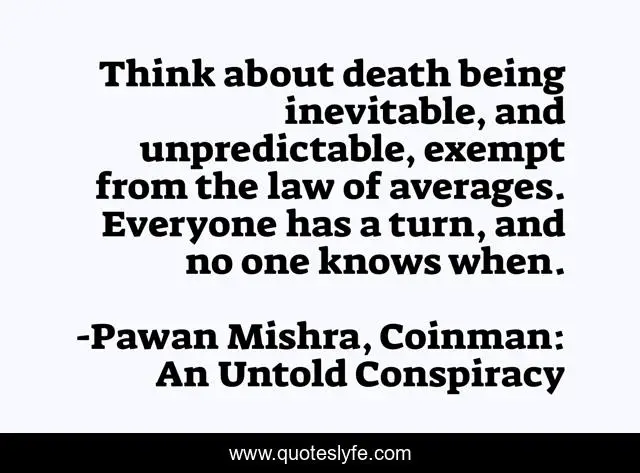 This page presents the quote "Think about death being inevitable, and unpredictable, exempt from the law of averages. Everyone has a turn, and no one knows when.". Author of this quote is Pawan Mishra, Coinman: An Untold Conspiracy. This quote is about life, death, dying, die, unpredictable, live, inevitable,.