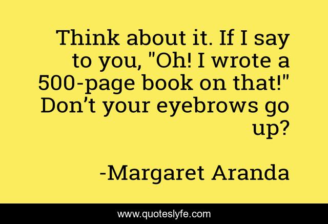 This page presents the quote "Think about it. If I say to you, "Oh! I wrote a 500-page book on that!" Don’t your eyebrows go up?". Author of this quote is Margaret Aranda. This quote is about book, inspiraiton, author,.