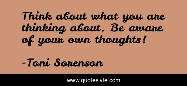 This page presents the quote "Think about what you are thinking about. Be aware of your own thoughts!". Author of this quote is Toni Sorenson. This quote is about brain, awareness, thoughts,.