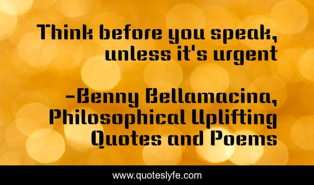 This page presents the quote "Think before you speak, unless it's urgent". Author of this quote is Benny Bellamacina, Philosophical Uplifting Quotes and Poems. This quote is about life, love, relationship, humour, best-ever, wisdom, famous, affection,.