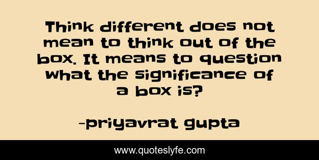 This page presents the quote "Think different does not mean to think out of the box. It means to question what the significance of a box is?". Author of this quote is priyavrat gupta. This quote is about steve-jobs, think-outside-the-box, creativity, apple, think,.