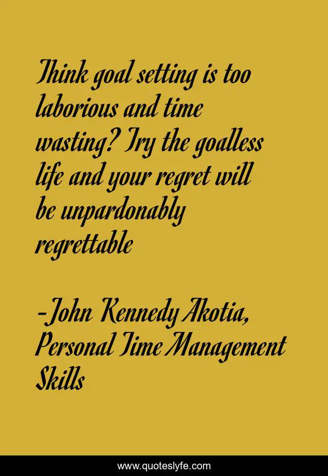This page presents the quote "Think goal setting is too laborious and time wasting? Try the goalless life and your regret will be unpardonably regrettable". Author of this quote is John Kennedy Akotia, Personal Time Management Skills. This quote is about time-management, goal-setting,.
