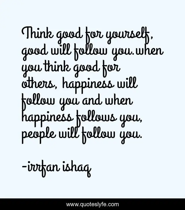 This page presents the quote "Think good for yourself, good will follow you.when you think good for others, happiness will follow you and when happiness follows you, people will follow you.". Author of this quote is irrfan ishaq. This quote is about confidence, good, love, people, positive, motivational, optimistic, inspirational, follow,.