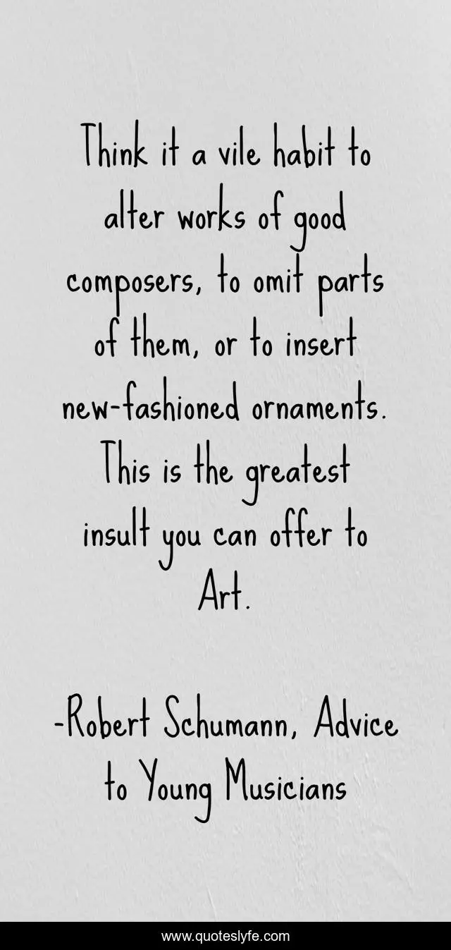 This page presents the quote "Think it a vile habit to alter works of good composers, to omit parts of them, or to insert new-fashioned ornaments. This is the greatest insult you can offer to Art.". Author of this quote is Robert Schumann, Advice to Young Musicians. This quote is about composers, art, improvising, musicians, music,.