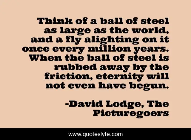 This page presents the quote "Think of a ball of steel as large as the world, and a fly alighting on it once every million years. When the ball of steel is rubbed away by the friction, eternity will not even have begun.". Author of this quote is David Lodge, The Picturegoers. This quote is about eternity, science,.