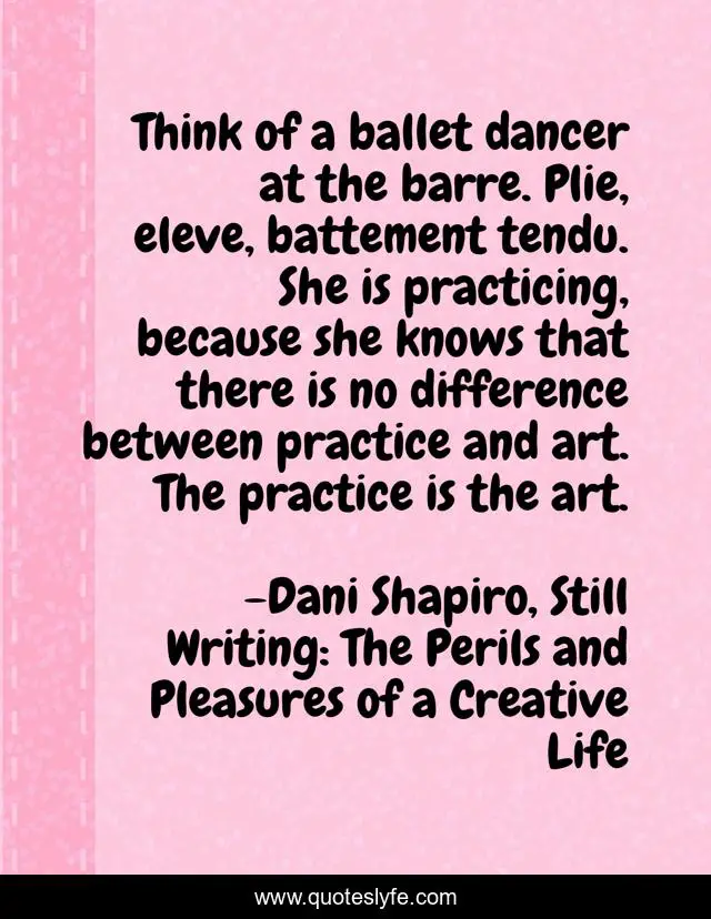 This page presents the quote "Think of a ballet dancer at the barre. Plie, eleve, battement tendu. She is practicing, because she knows that there is no difference between practice and art. The practice is the art.". Author of this quote is Dani Shapiro, Still Writing: The Perils and Pleasures of a Creative Life. This quote is about writers, art, artist, writing,.