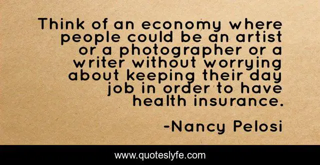 This page presents the quote "Think of an economy where people could be an artist or a photographer or a writer without worrying about keeping their day job in order to have health insurance.". Author of this quote is Nancy Pelosi. This quote is about job, day, artist,.