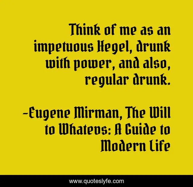 This page presents the quote "Think of me as an impetuous Hegel, drunk with power, and also, regular drunk.". Author of this quote is Eugene Mirman, The Will to Whatevs: A Guide to Modern Life. This quote is about drinking, philosophy, humor,.