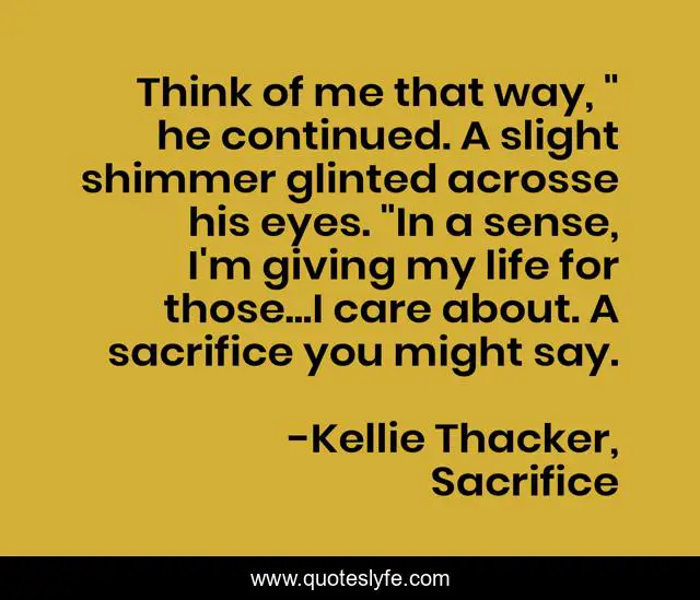 This page presents the quote "Think of me that way, " he continued. A slight shimmer glinted acrosse his eyes. "In a sense, I'm giving my life for those...I care about. A sacrifice you might say.". Author of this quote is Kellie Thacker, Sacrifice. This quote is about romance, sacrifice, young-adult, vampire,.