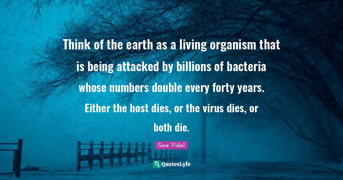 This page presents the quote "Think of the earth as a living organism that is being attacked by billions of bacteria whose numbers double every forty years. Either the host dies, or the virus dies, or both die.". Author of this quote is Gore Vidal. This quote is about earth, host, bacteria, forty, dies, billions, thinking, numbers, years,.