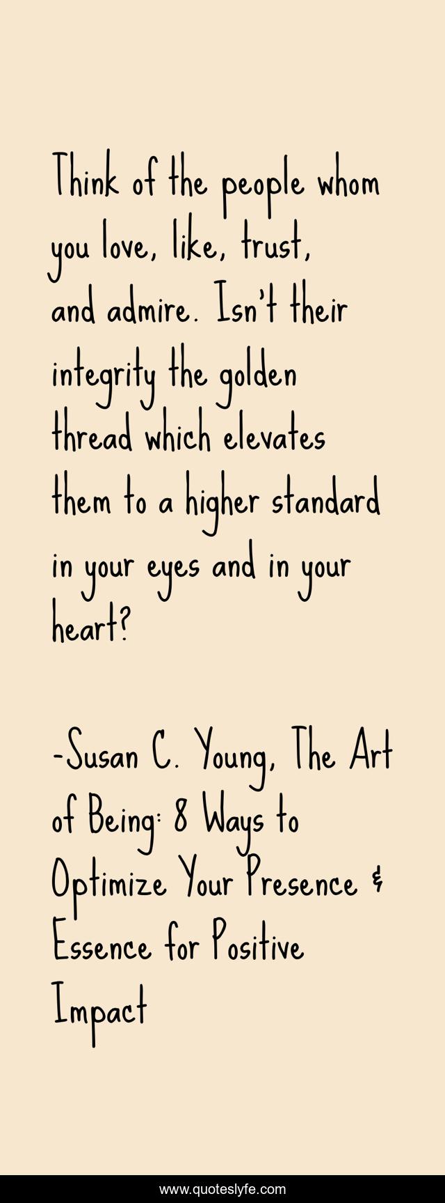 This page presents the quote "Think of the people whom you love, like, trust, and admire. Isn’t their integrity the golden thread which elevates them to a higher standard in your eyes and in your heart?". Author of this quote is Susan C. Young, The Art of Being: 8 Ways to Optimize Your Presence & Essence for Positive Impact. This quote is about confidence, susan-young, relationship, communication-skills, communication, first-impressions, authenticity, trust, integrity,.