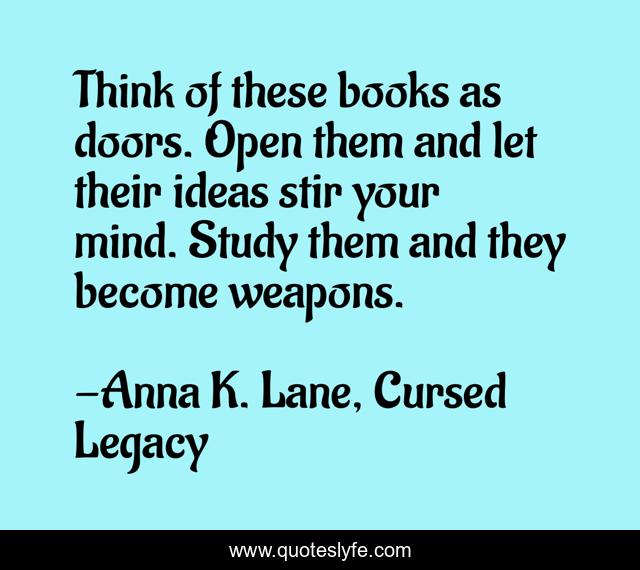 This page presents the quote "Think of these books as doors. Open them and let their ideas stir your mind. Study them and they become weapons.". Author of this quote is Anna K. Lane, Cursed Legacy. .