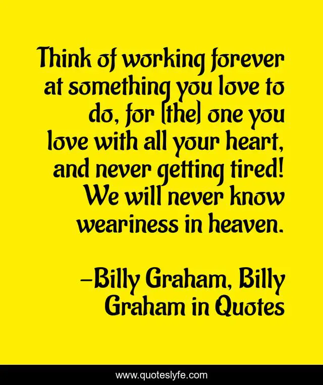 This page presents the quote "Think of working forever at something you love to do, for [the] one you love with all your heart, and never getting tired! We will never know weariness in heaven.". Author of this quote is Billy Graham, Billy Graham in Quotes. This quote is about work, billy-graham,.