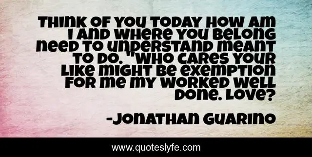 This page presents the quote "Think of you today how am i and where you belong need to understand meant to do. "Who cares your like might be exemption for me my worked well done. Love?". Author of this quote is Jonathan Guarino. This quote is about lfe, inspired, heaven, love, affection,.