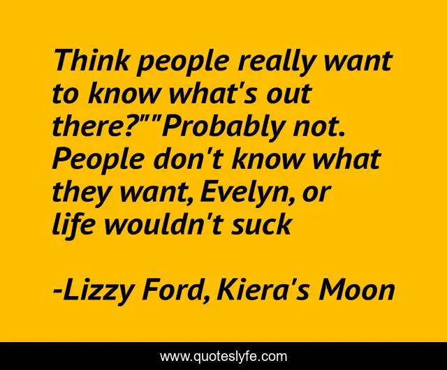 This page presents the quote "Think people really want to know what's out there?""Probably not. People don't know what they want, Evelyn, or life wouldn't suck". Author of this quote is Lizzy Ford, Kiera's Moon. This quote is about sarcasm, irony, humor,.