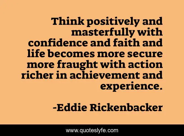 This page presents the quote "Think positively and masterfully with confidence and faith and life becomes more secure more fraught with action richer in achievement and experience.". Author of this quote is Eddie Rickenbacker. This quote is about positive, confidence,.