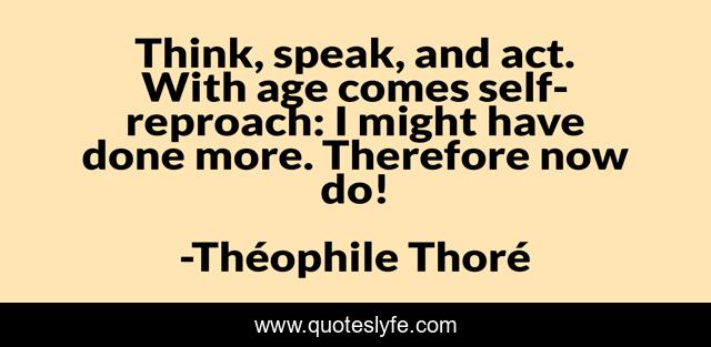 This page presents the quote "Think, speak, and act. With age comes self-reproach: I might have done more. Therefore now do!". Author of this quote is Théophile Thoré. This quote is about action, carpe-diem, youth, regret, inspiration,.