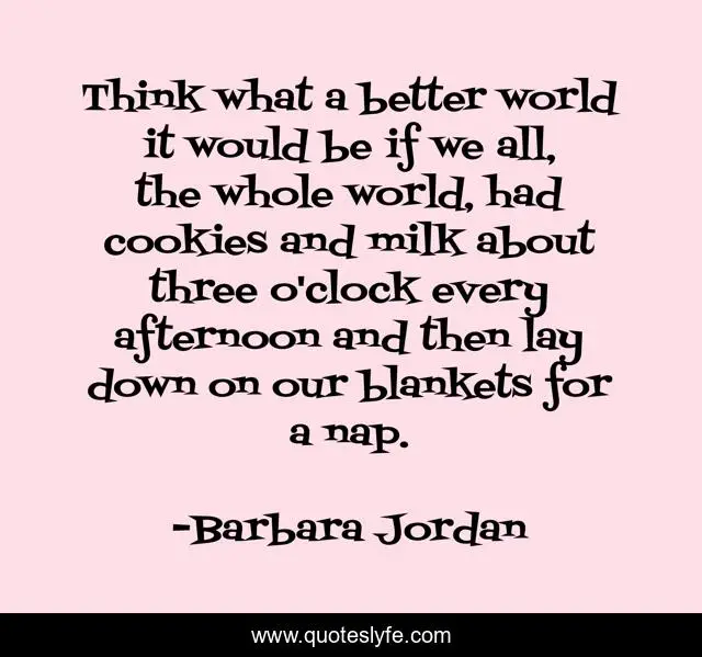 This page presents the quote "Think what a better world it would be if we all, the whole world, had cookies and milk about three o'clock every afternoon and then lay down on our blankets for a nap.". Author of this quote is Barbara Jordan. .