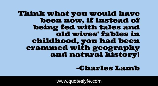 This page presents the quote "Think what you would have been now, if instead of being fed with tales and old wives' fables in childhood, you had been crammed with geography and natural history!". Author of this quote is Charles Lamb. .