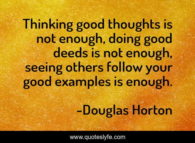 This page presents the quote "Thinking good thoughts is not enough, doing good deeds is not enough, seeing others follow your good examples is enough.". Author of this quote is Douglas Horton. This quote is about thinking, thoughts,.